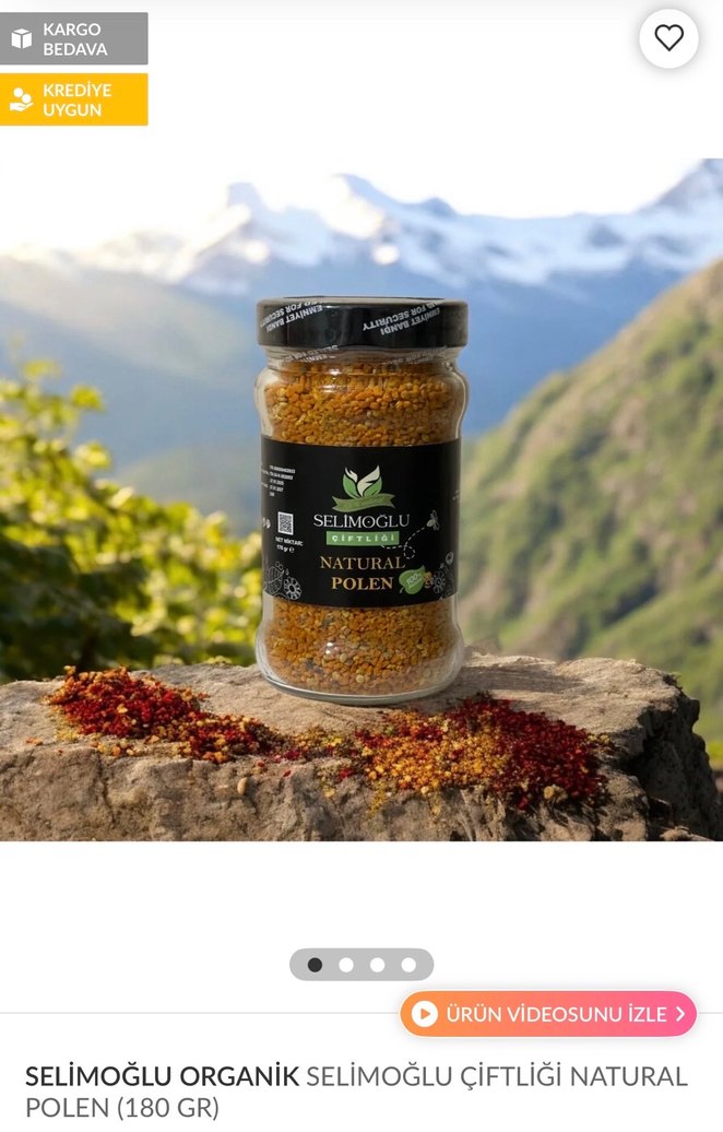 Selimoğlu doğal arı poleni, parlak altın renkli toz halinde ve şeffaf kavanozda sunuluyor.