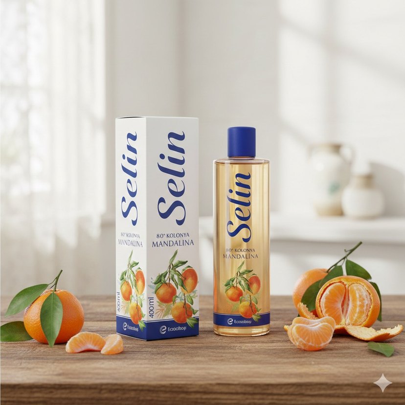 Selin markasının 400 ml mandalina kokulu kolonya ürünü, taze ve narenciye aromasıyla ferahlatır. Mavi kapaklı şişede sunulur.