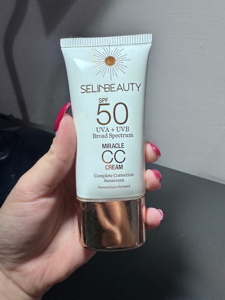 SelinBeauty SPF 50 CC krem, geniş spektrum UVA ve UVB koruması sağlar ve ciltte tam düzeltme yapar. Dermatolojik olarak test edilmiştir. ☀️ Ürünün çoğu doludur az kullanılmıştır.