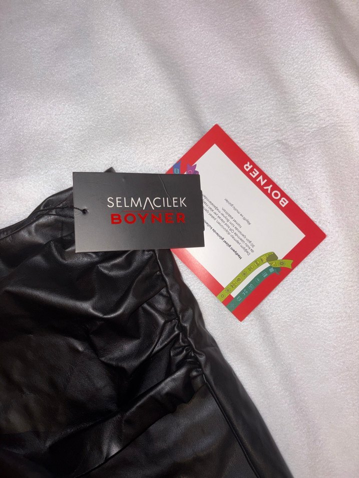Hediye geldi bedeni olmadı önden kuşaklı bağlamalı model deri etek. Etiketi üstünde hala kağıdına sarılı olarak kutusunda duruyor