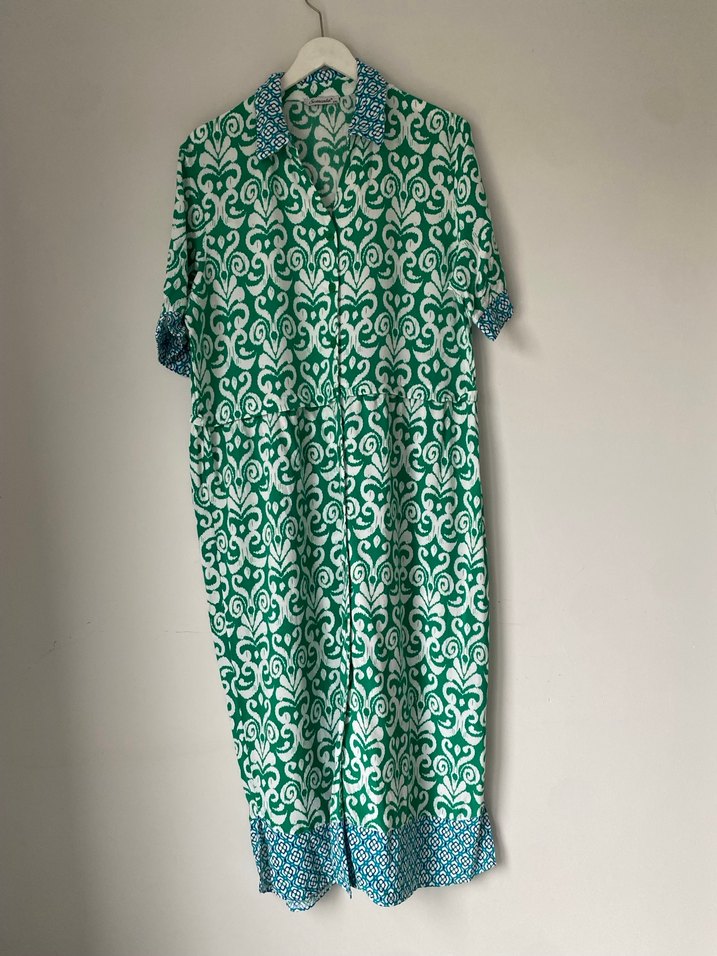 Sementa önden düğmeli uzun elbise. desenli, yakalı ve kısa kolludur. Rahat kesimli, pamuklu kumaş iki kol arası 55 cm uzunluğu 124 cm.