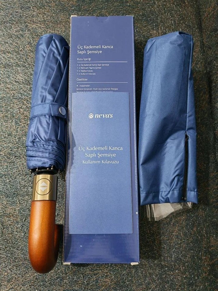 Premium Nevas marka şemsiye; 210T Pongee kumaş ve dayanıklı metal yapısıyla üretilmiştir. Tam otomatik sistemi ve 50T çelik–fiberglas gövdesi sayesinde 10K rüzgârlara dayanır. 61 cm uzunluğu ve 114 cm genişliğiyle tam koruma sunar. Sendika hediyesi olup hiç kullanılmamıştır; etiketli ve ambalajlı şekilde gönderilecektir.