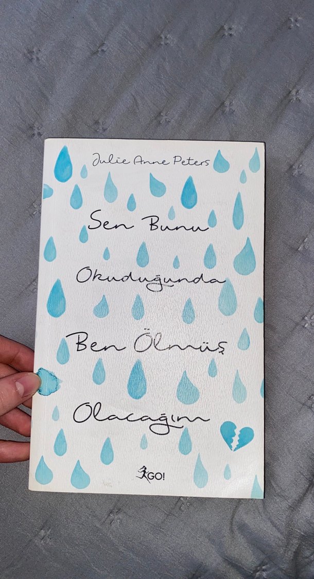 Julie Anne Peters'in "Sen Bunu Okuduğunda Ben Ölmüş Olacağım" adlı romanı, duygusal anları ve içtenliği yansıtıyor. Mavi damlalar ve kırık kalp simgesi kapakta yer alıyor.