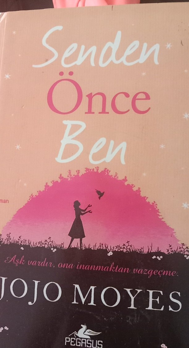 Jojo Moyes'in 'Senden Önce Ben' romanı, pembe zeminli kapağında kadın silueti bulunuyor. "Aşk vardır, ona inanmaktan vazgeçme" ifadesi yer alıyor.