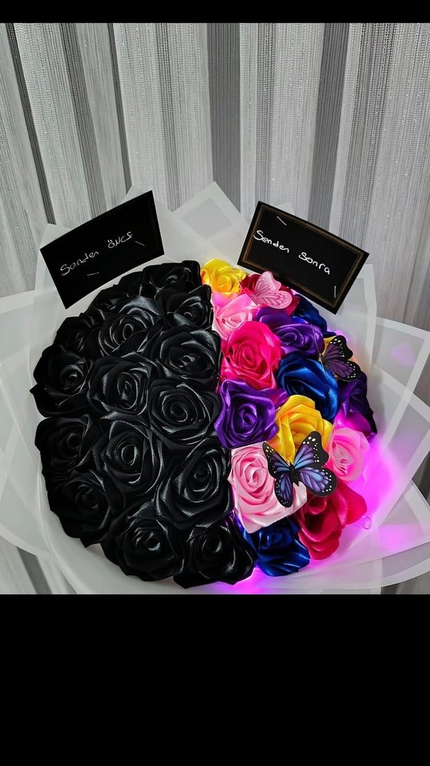 Farklı renklerde ve siyah güllerden oluşan, kurdele detaylı, gotik ve avangart stile uygun bir buket.