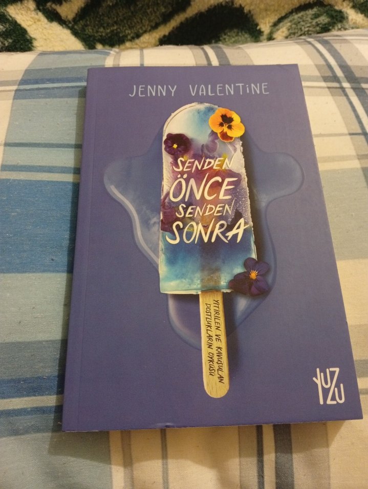 Jenny Valentine'ın 'Senden Önce Senden Sonra' adlı romanı, mor kapaklı ve üzerinde dondurma ile çiçekler bulunan bir tasarıma sahip. Yuzu yayınevi. 1 kez okundu iyi durumda