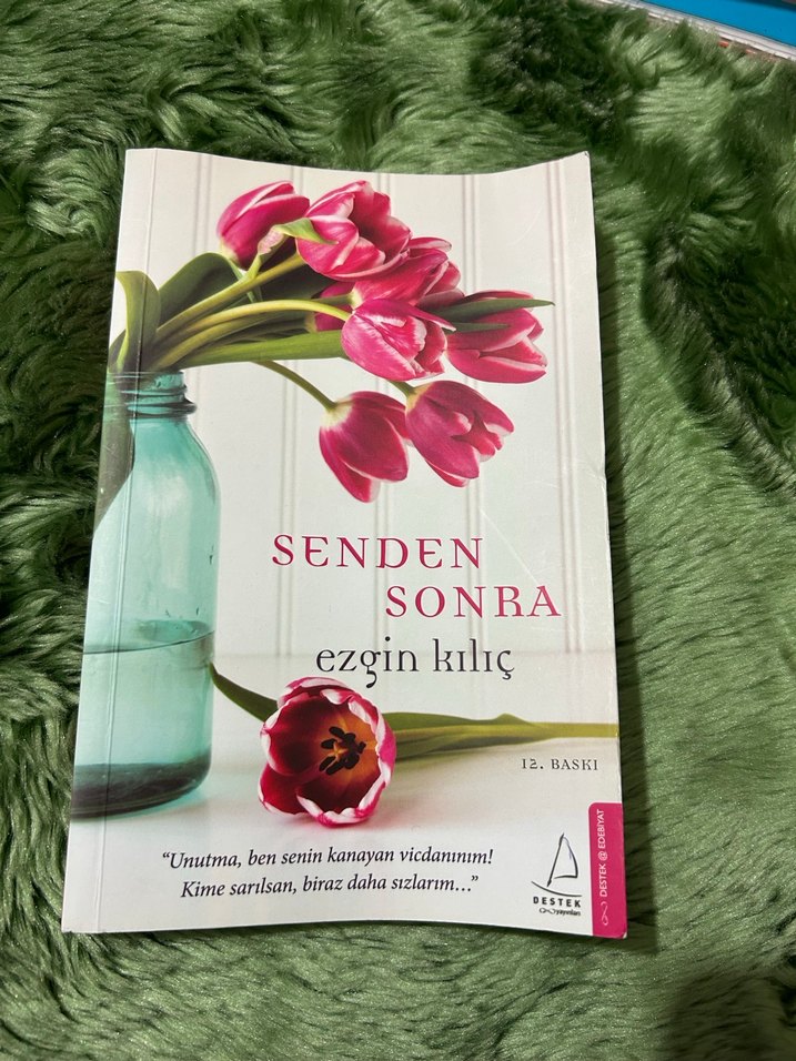 Ezgin Kılıç'ın 12. baskı romanı 'Senden Sonra' pembe laleler ve cam şişe görseliyle. "Unutma, ben senin kanayan vicdanın!" ifadesi yer alıyor.