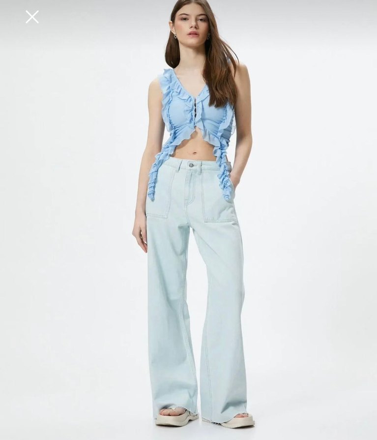 Pastel mavi tonlarında, bağlama detaylı, gevşek kesim ve normal boyda denim pantolon. Streetwear tarzına uygun büzgü detayları içerir. Günlük kullanıma uygundur. 26-32