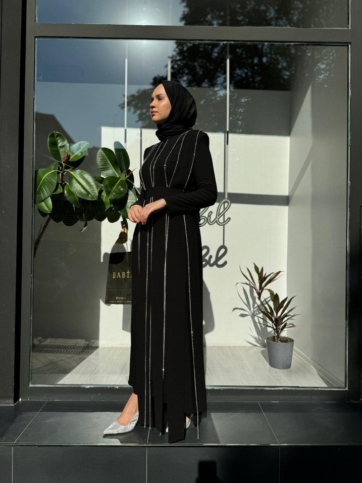 SENNA DESİGN Drapeli Siyah Uzun Taşlı Tesettür Abiye elbise