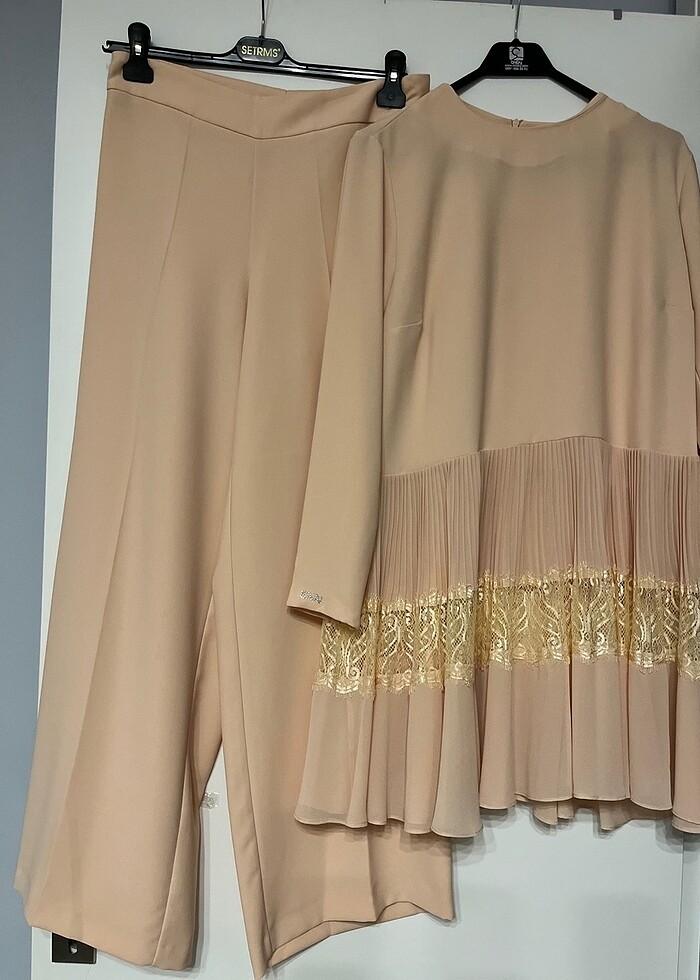 Tertemiz mükemmel sorunsuz kusursuz. Hiç gıyınılmedı. Resımde ışık yansımasından dolayı dantelı sarı cıkıyor, fakat dantel kumaşla aynı gül kurusu. Üst beden iki kol arası 50cm boy 86 cm pantolon bel 40cm boy 105cm paça genişlik 30cm. Son görsele kırmızı renkte üzerinde duruşu ekledım #senna #eser