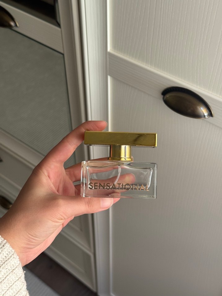 Sensationa kadın parfümü, altın kapaklı şeffaf cam şişesiyle zarif bir koku deneyimi sunar. ✨Boş şişe