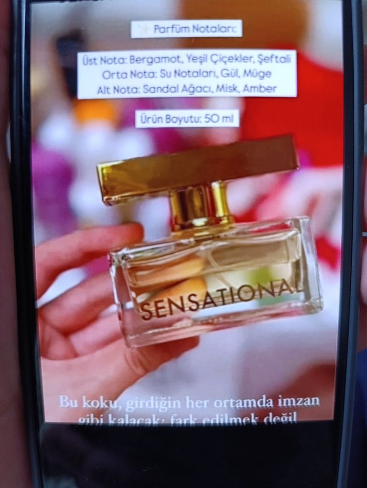 SENSATIONAL kadın parfümü; üst notalarda bergamot, yeşil çiçekler, şeftali; orta notalarda su notaları, gül, müge; alt notalarda sandal ağacı, misk, amber içerir. 50 ml şişede sunulur.