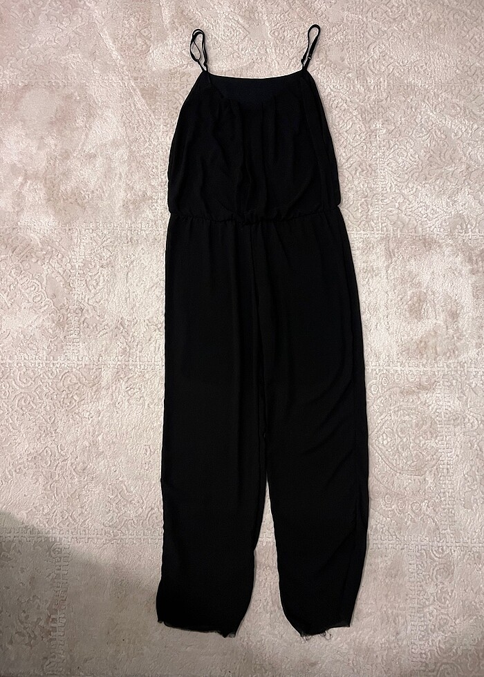 Askılı, siyah şifondan, içi kısa şort astarlı şık bir uzun tulum. Fotoğraflarda astar ve şifon detayını görmeniz için sona ekledim.