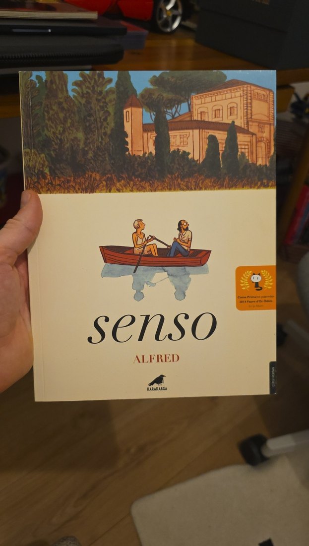 Alfred'in "Senso" romanı, iki kişinin küçük bir teknede olduğu ve arka planda ağaçlar ile büyük bir bina bulunan kapak tasarımıyla öne çıkıyor.
