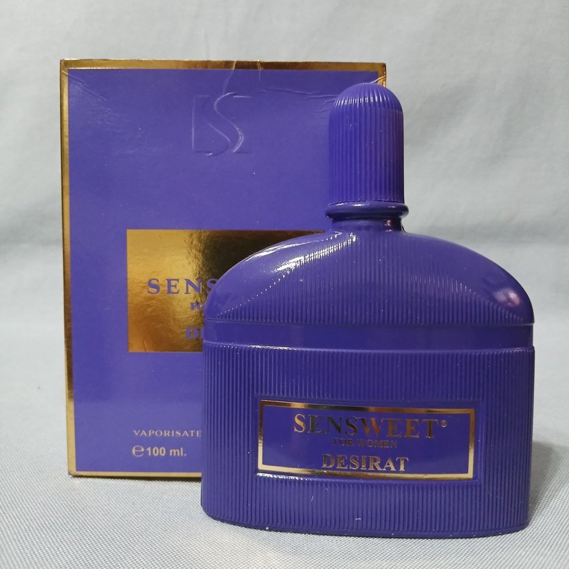 SENSWEET DESIRAT kadın parfümü, 100ml sprey şişede ve belirgin mor tasarımla sunulmaktadır. Eşsiz bir koku deneyimi sağlar.