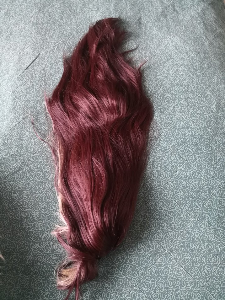 Kızıl, önlerinde sarı detayları var. Tertemiz, kesim yapılarak istenilen şekilde kullanıma uygun. Başa takılan kısmı ayarlanabilir özellikle. Yumuşak, gerçek saç niteliğinde. Fotoğraflarda boy vs. görünür