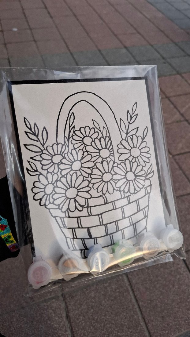 Sepette papatyalar tasarımı olan siyah beyaz boyama seti, küçük boya kapları ile birlikte.