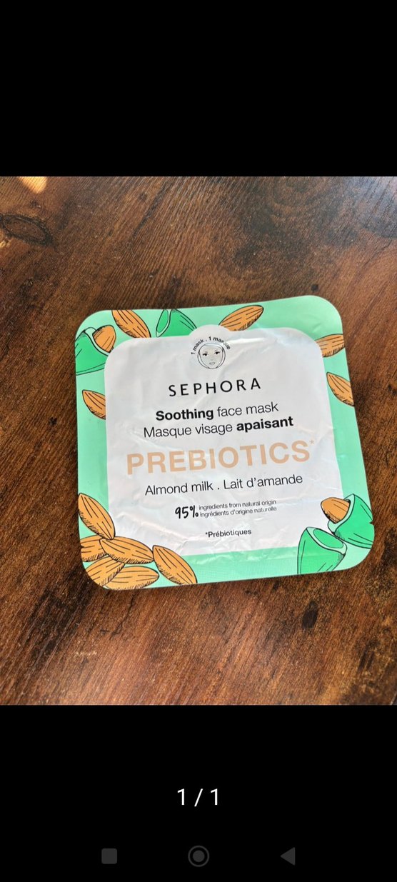 SEPHORA yatıştırıcı yüz maskesi, badem sütü ve prebiyotikler içerir, %95 doğal kaynaklı malzemelerle cildi sakinleştirir ve besler.