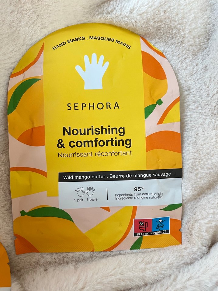 Sephora'nın yabani mango yağı içeren, %95 doğal kökenli içeriklerle besleyici ve rahatlatıcı el maskesi.