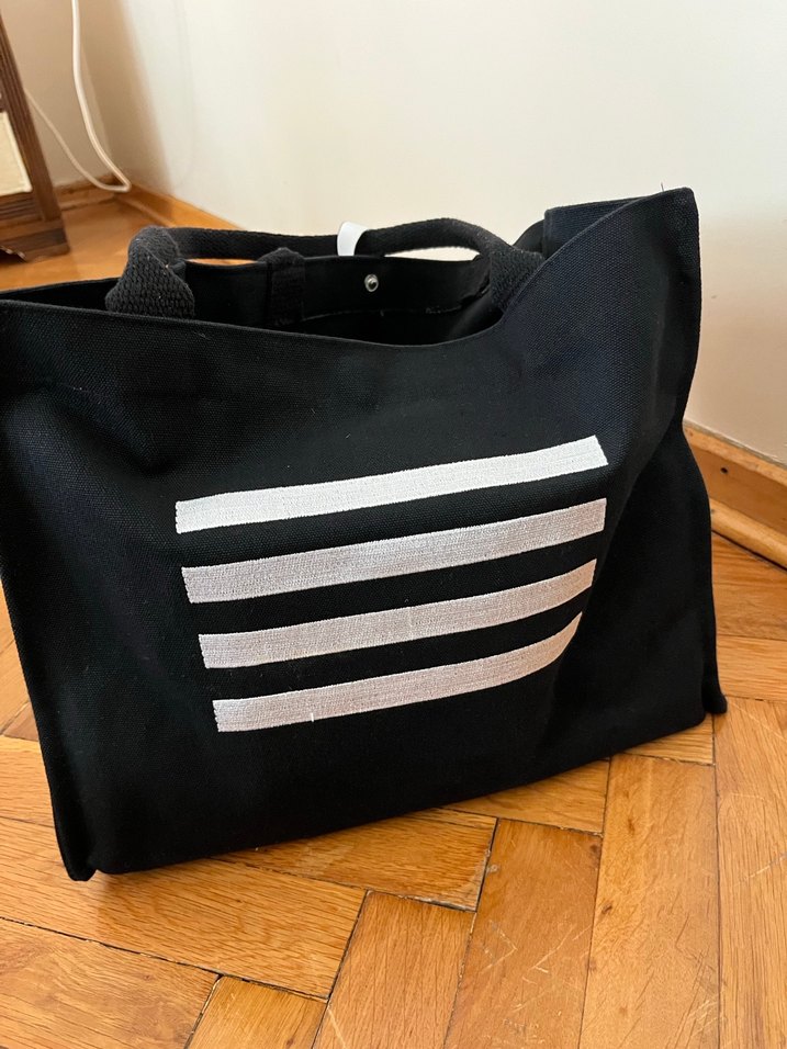 Sentetik kumaştan siyah, baskılı çizgili kadın spor çantası. Günlük kullanım ve şık sokak tarzı için uygundur.