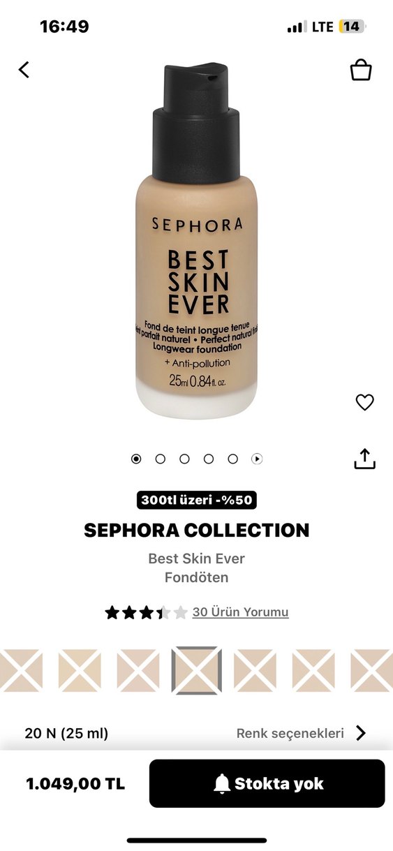 Sephora Collection Best Skin Ever fondöten, parlak bej tonunda, uzun süre kalıcı ve anti-pollution özellikli. Doğal bitişli, 25 ml şişede sunulur.