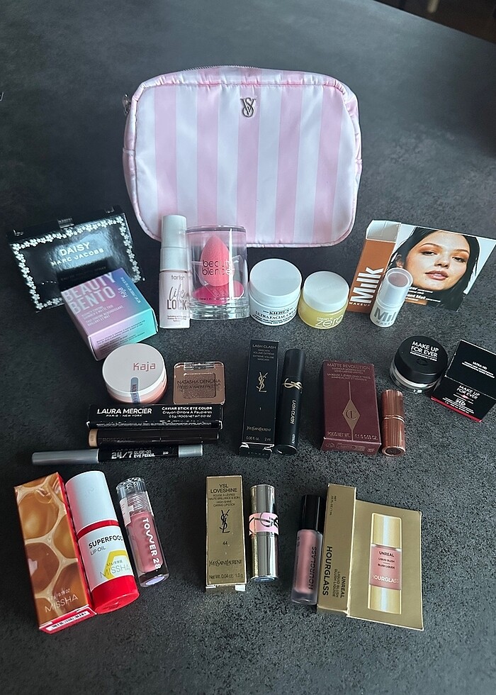 Sephorada en çok satan ürünlerin küçük boylarından bazı ürünlerin tam boyunda kendim oluşturduğum settir. Tek tek satınca daha pahalı olan ürünleri set haline getirdim. Görünen tüm ürünler sıfır hiç kullanılmadı.Victoria’s Secret makyaj çanta içinde gönderilecektir. İçeriklerin renk ve bilgileri son fotoğrafta mevcuttur. İçinden ürün çıkarıp fiyat değişmez ancak istediğiniz ürünü tek almak isterseniz stock sorabilirsiniz. Mac Prep ,Hourglass Likit Allık Scene,Make up For ever Sabitleyici Pudra,Natasha Denona,Rare Beauty Lip Oil Hope Ruj,Tower 28 Ruj Lip Jelly Pistachio,Charlotte Tilbury Pillow Talk Ruj, Ysl Loveshine 44 Ruj,Ysl Lash Clash Rimel Siyah,Milk Make Up Baked,Urban Decay Göz Kalemi,Kaja Far Palet ,Laura Mercier,Tarte,Beauty Blender sünger,Benefit Kaş Kalemi,Banila Co Clean İt Zero Temizleme Balmı,Patrickş Ta Kiehl’s ultra facial nemlendirici krem,Missha Rice