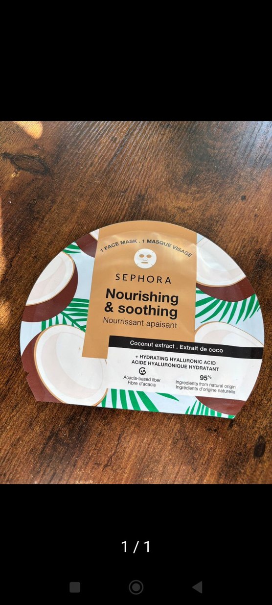 Sephora yüz maskesi, hindistancevizi özü ve nemlendirici hyaluronik asit içerir, cildi besler ve yatıştırır, %95 doğal içerik barındırır.