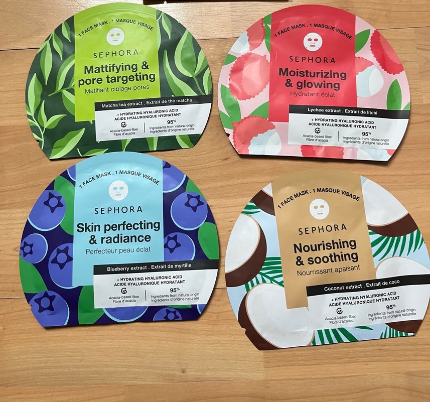Sephora yüz maskeleri seti; matlaştırıcı, nemlendirici, cilt mükemmelleştirici ve besleyici seçeneklerle doğal özler ve hyaluronik asit içerir. 4 adet yüz maskesi orijinaldir belirttim detaylıca️