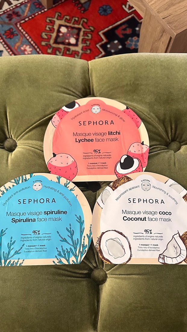 Sephora yüz maskeleri, %95 doğal içerikli Spirulina, Hindistan Cevizi ve Lychee seçenekleriyle nemlendirir ve besler. 3 adet
