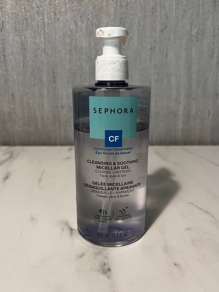 Sephora Temizleyici ve Yatıştırıcı Micellar Jel, mavi papatya çiçeği suyu içerir. Yüz, göz ve dudak makyajını temizler ve ferahlatır.