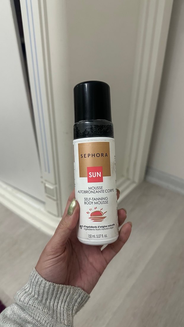 Sephora Sun kendini bronzlaştıran vücut köpüğü, doğal görünümlü bronzluk sağlar. 150 ml ve doğal kökenli içerikler içerir. bir kez kullanildi