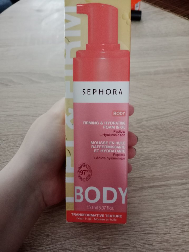 Sephora vücut losyonu, sıkılaştırıcı ve nemlendirici yağ köpüğü dokusuna sahiptir. Peptitler ve hyaluronik asit içerir, cildi yumuşak ve nemli tutar. 150 ml.