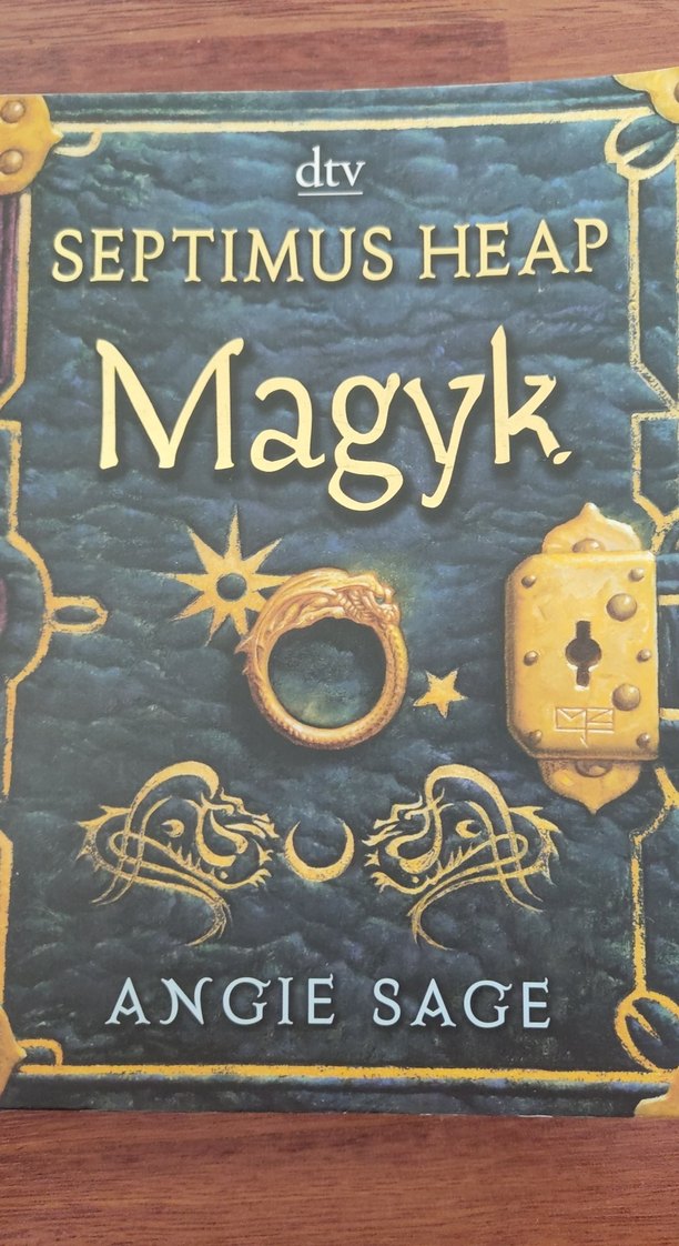 Angie Sage'in Septimus Heap serisinden 'Magyk' kitabı, büyülü temalı ve detaylı kapak tasarımıyla dikkat çekiyor.