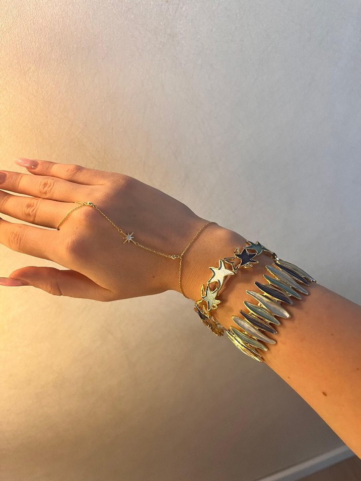 Yıldız motifli esnek renkli kadın bileklik. Parlak yüzeyli ve yılan deseniyle günlük kullanım için uygun. ✨