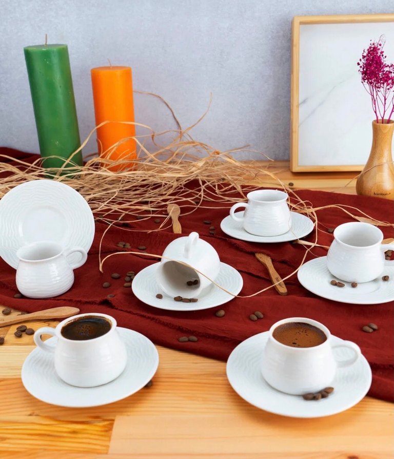 Dokulu tasarıma sahip beyaz seramik fincanlar ve uyumlu tabaklardan oluşan set, sıcak içecekler için uygundur. ☕Türk kahvesi fincanı