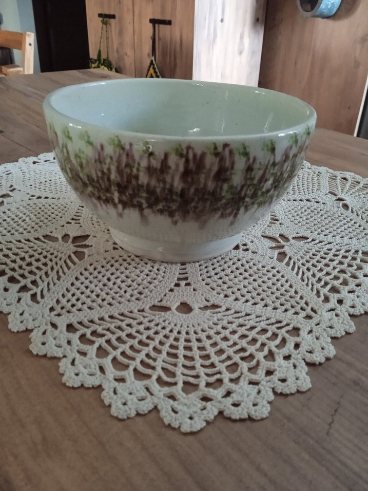 Kütahya işi,akıtma boya, derin kase. Eski dönem ürünü. İyi durumda. Ayak kısmında atık var. Görünümünü bozan farkedilen birşey değil..Fotoğrafını çektim. İç kısmında da üretim hatası noktalar var. 15cm çapında, 8 cm yüksekliğinde. Takımı olan daha büyük iki adet kase de sayfada satışta.