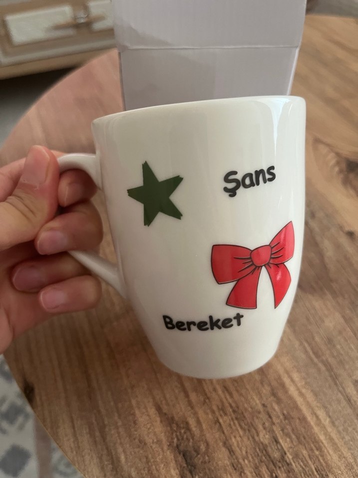 Beyaz seramik kupa, üzerinde pastel renklerde bir yıldız ve kırmızı kurdele ile 'Bereket' ve 'Şans' yazıları bulunur. ☕