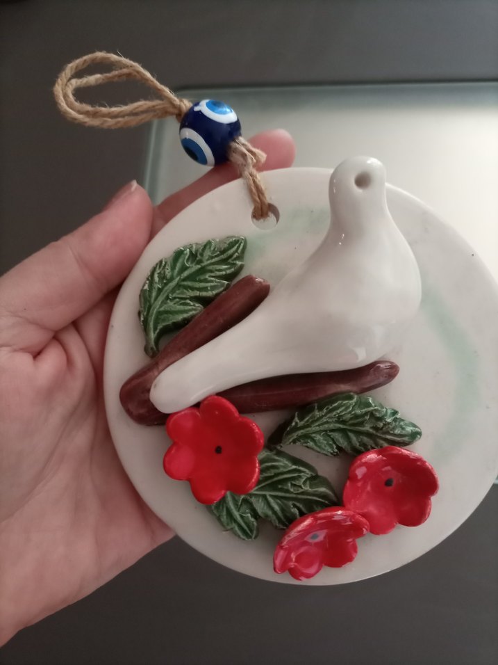 Beyaz kuş, kırmızı çiçekler ve yeşil yapraklardan oluşan seramik süs, ip ve nazar boncuğu ile birlikte.