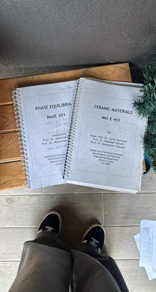 Orta Doğu Teknik Üniversitesi'nden Seramik Malzemeler (Met E 451) ve Faz Dengeleri (MetE 301) ders notları, spiral ciltli. Bunların dışında da ders notları mevcuttur. Görsellerde mevcut. NOT: Sormadan almayınız..