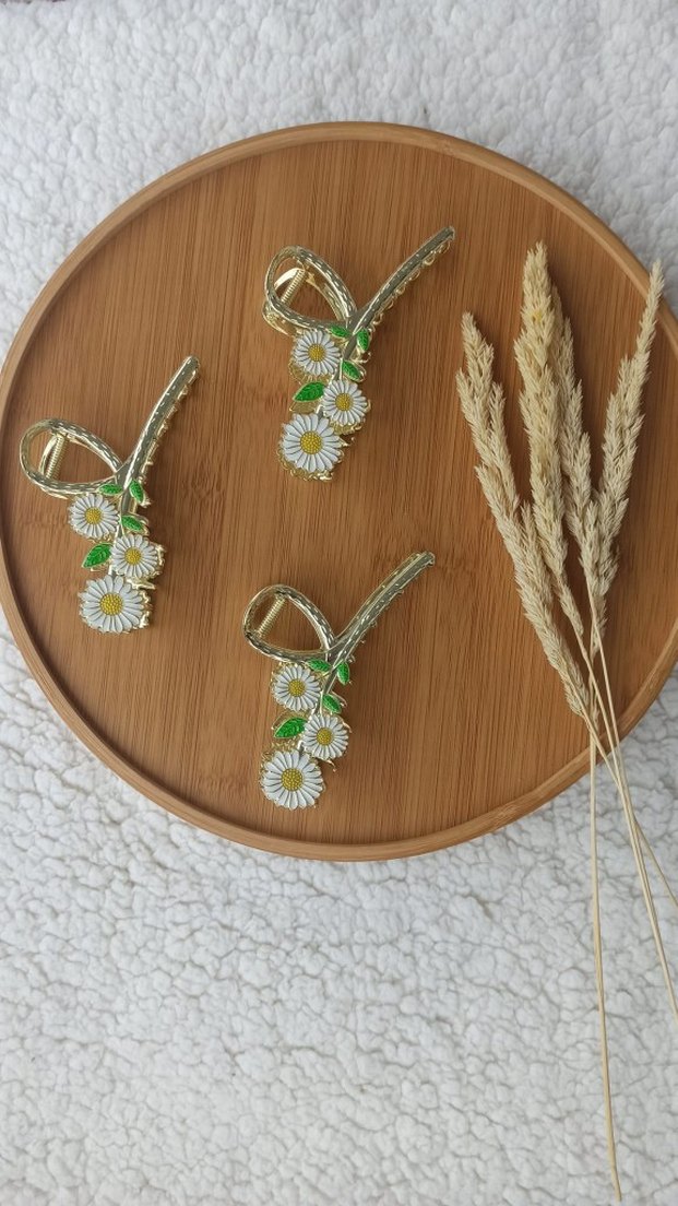 Minimalist bohem tarzına uygun, boncuklu papatya detaylı beyaz seramik saç tokası.