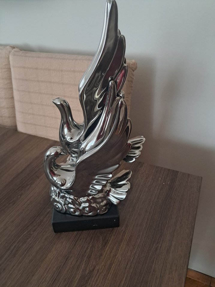 Parlak gri renkte, kanatları yukarı kalkık bir kuş figürü, siyah kaide üzerinde duruyor. Yansıtıcı yüzeyi şık bir görünüm sağlıyor. ️