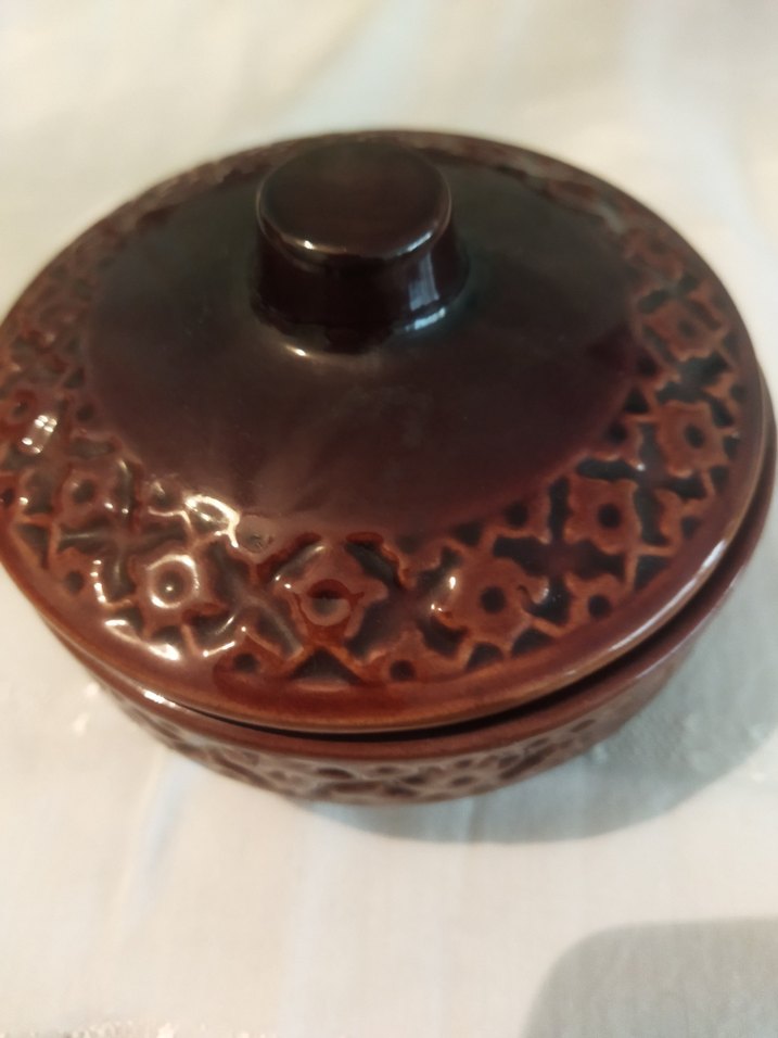 Çok az kullanılmış seramik 11 cm boyutunda 4 cm derinliğinde kapağınin içinde küçük bir sıyrık olan kahverengi renkte desenli sekerlik