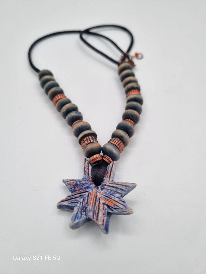 Seramik ve boncuklu, renkli batik desenli yıldız figürlü bohem tarzda kadın kolye. Özel tasarimdir. Tek uretimdir. Ahşap ve metal boncuklar birlikte kullanılmıştır. Detaylar fotograflardadir.