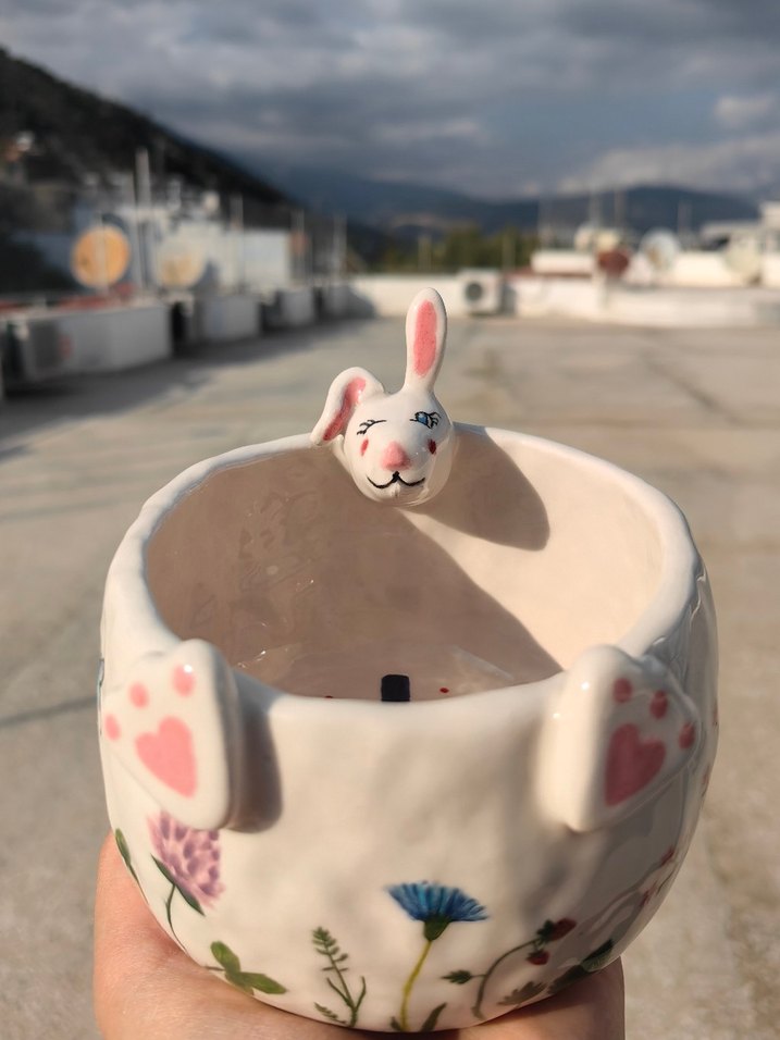 El yapımı El boyaması kalıp işi değildir. Gıdayla temasa uygun üründür. Pastel çiçek desenli, beyaz seramikten yapılmış, sevimli tavşan figürlü bowl kase.
