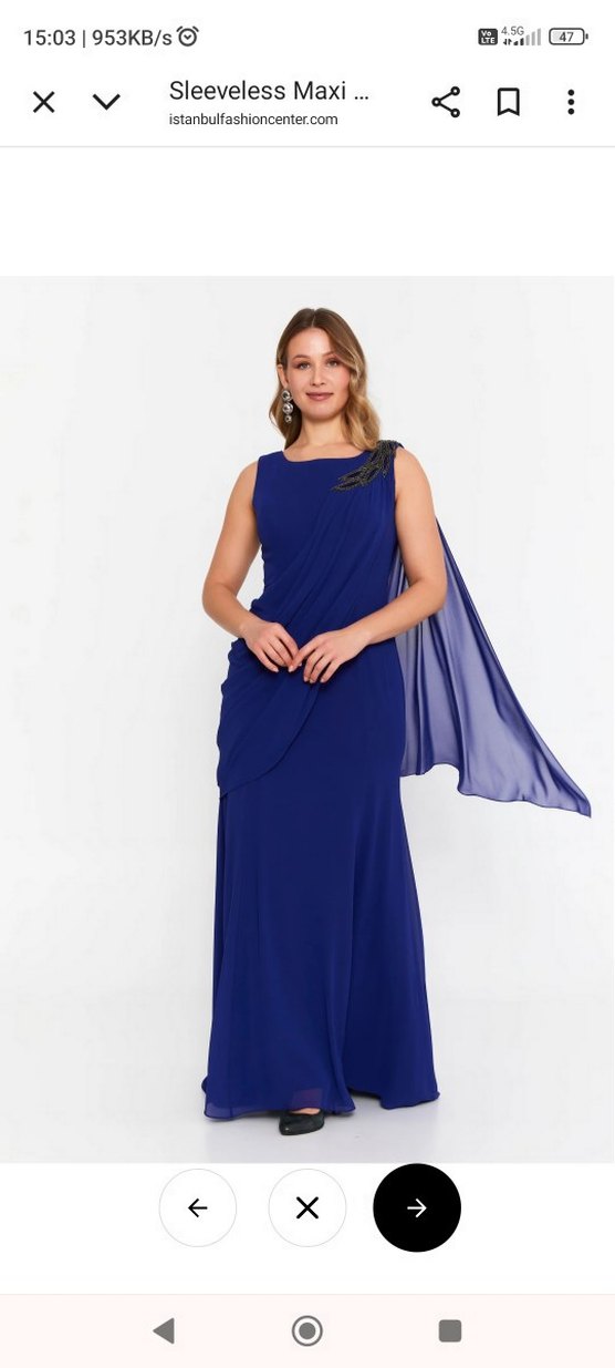 bir kez giyildi.Mavi renkte, işlemeli detaylı ve drapeli uzun abiye elbise. Straplez yakalı, regular fit ve şık pelerin kol detayına sahip.