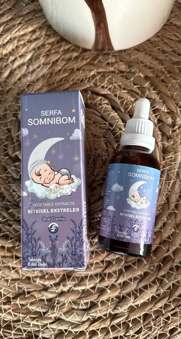 Serfa Somnibom oral damla, bitkisel ekstreler içerir ve rahat uyku desteği sağlar. Damla şişesi ve lavanta temalı ambalajla sunulur.