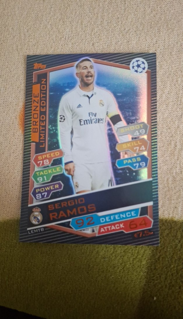 Beyaz Real Madrid formasıyla Sergio Ramos'un detaylı istatistiklerinin yer aldığı sınırlı sayıda üretilmiş kart. Pop kültür ve athleisure tarzı için koleksiyonluk. ⚽