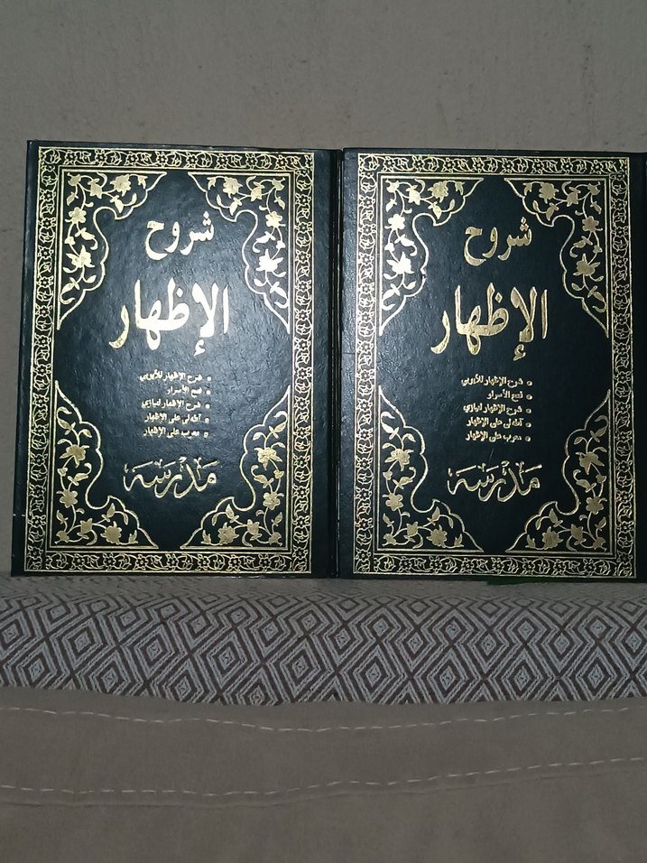 Şerh el-İzhar adlı dini kitabın iki ciltlik seti, siyah ve altın renkli süslü kapaklara sahiptir. Ön yüzünde detaylı süslemeler ve Arapça yazı yer alır.