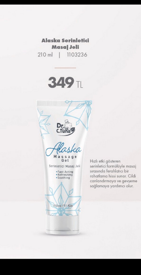 Dr. C. Tuna Alaska Masaj Jeli, hızlı etkili, serinletici ve rahatlatıcı bir formüle sahiptir. Masaj sırasında ferahlatıcı bir rahatlama hissi sunar, cildi canlandırmaya ve gevşemeye yardımcı olur. 210 ml'lik ürün, cilt yenilenmesini destekler.