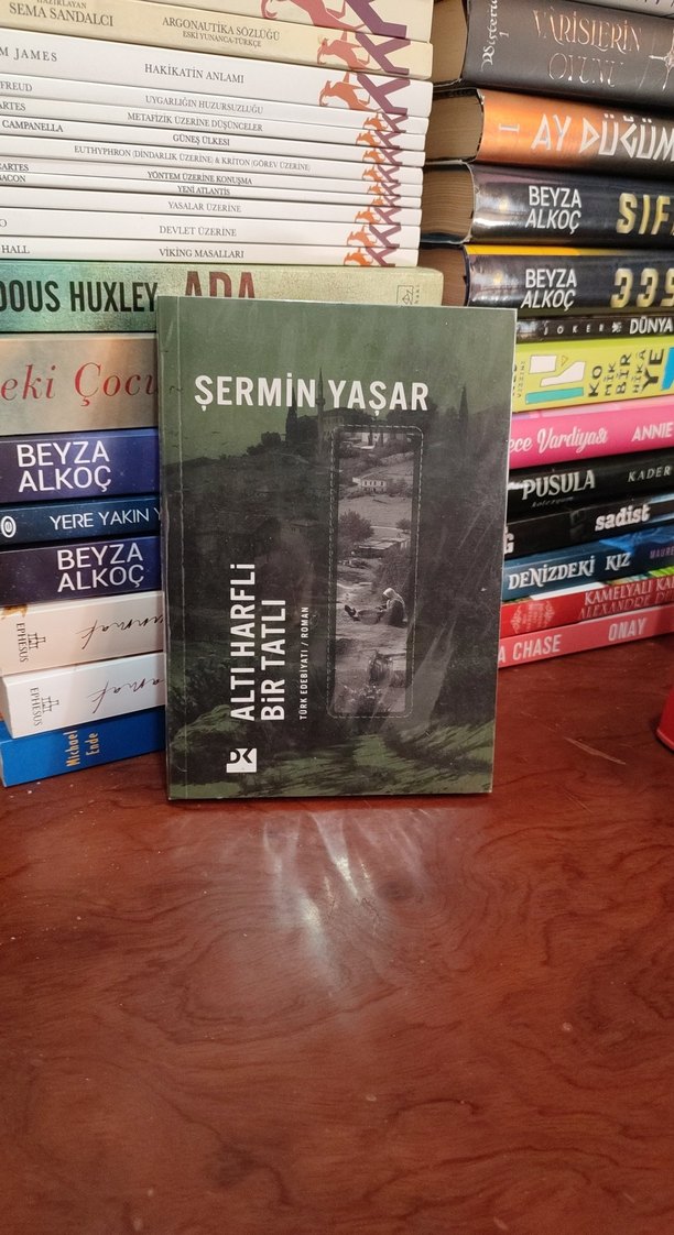 Şermin Yaşar'ın "Altı Harfli Bir Tatlı" adlı kitabı, çeşitli romanlar arasında yer alıyor. Kapağında pencere görünümlü koyu tonlarda bir görsel bulunuyor.